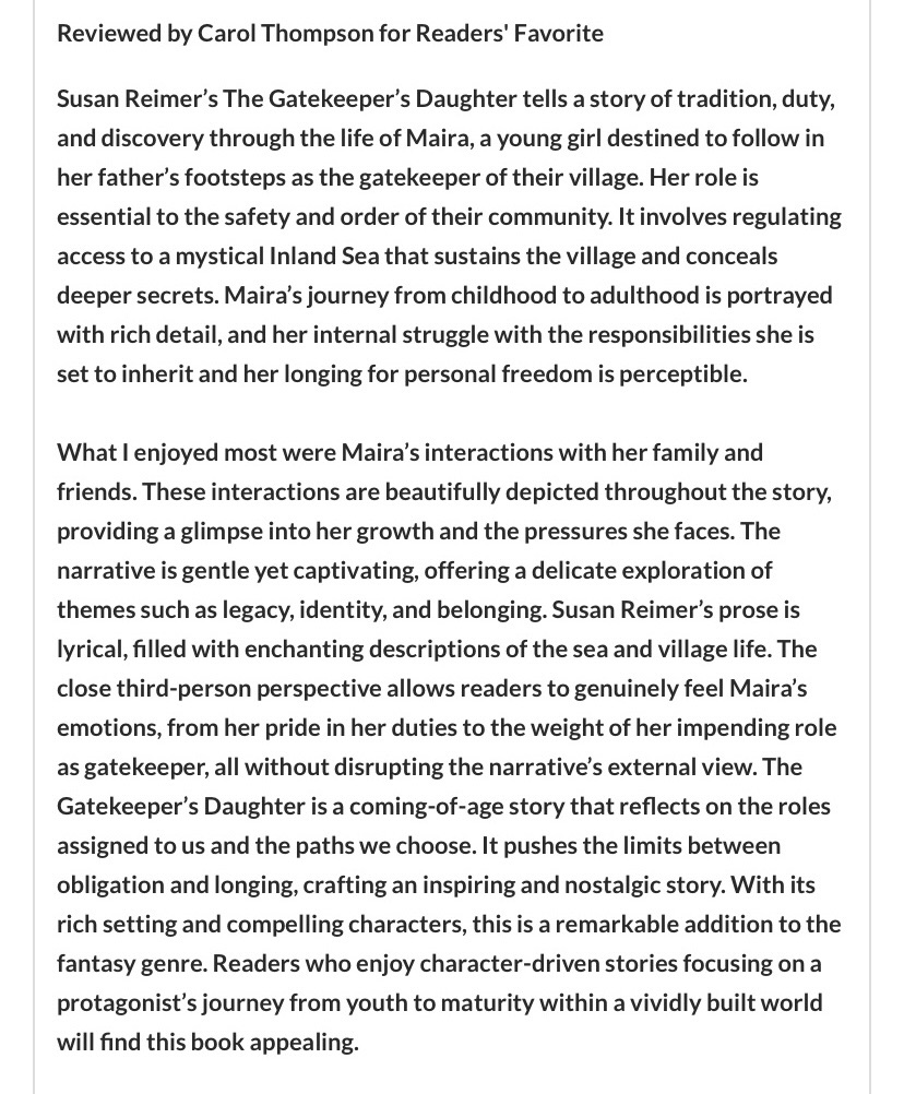 Reviews like this help readers find books to enjoy. I hope many more kids discover the mystery, adventure and inspiration in The Gatekeeper’s Daughter!